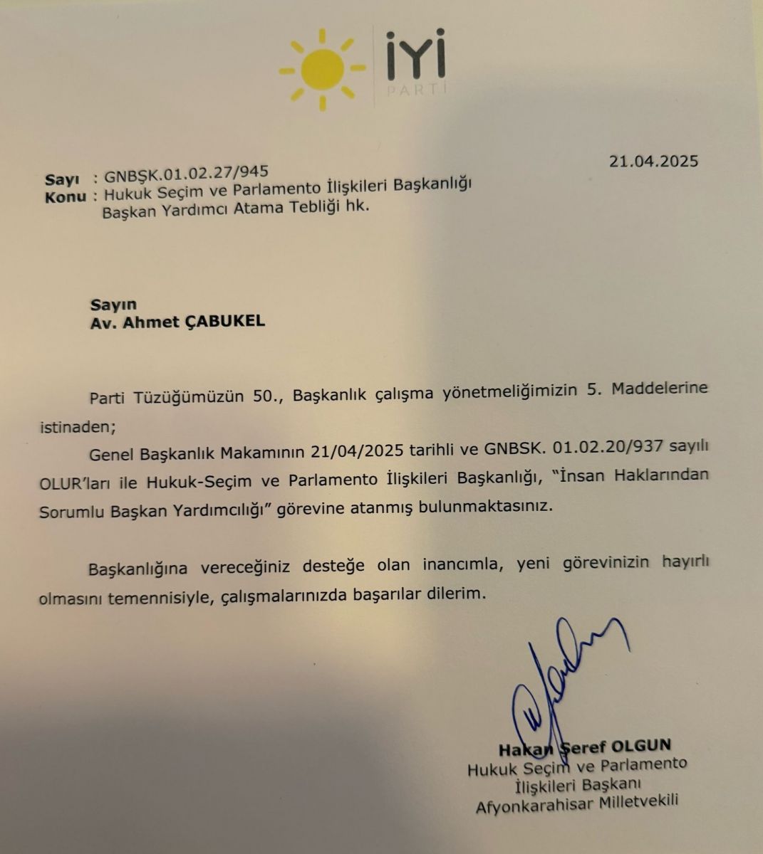 İYİ Parti'nin insan hakları politikalarının koordinasyonunu sağlayacak olan Çabukel, aynı zamanda hukuki süreçlerde partinin duruşunu temsil edecek ve insan hakları temelli meselelerde çözüm odaklı politikalar geliştirecek. Bu yeni görev, hem Ahmet Çabukel’in siyasi kariyerinde önemli bir dönüm noktası hem de İYİ Parti’nin insan haklarına verdiği önemin bir göstergesi olarak değerlendiriliyor.