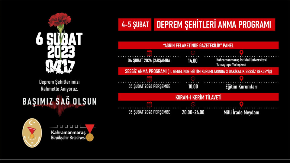 Anma programlarının ilki, 4 Şubat Çarşamba günü Kahramanmaraş İstiklal Üniversitesi Yamaçtepe Yerleşkesi’nde düzenlenecek olan “Asrın Felaketinde Gazetecilik” paneli ile başlayacak. Saat 14.00’da başlayacak programda, deprem sürecinde yaşananlar, kriz dönemlerinde basının rolü ve toplumsal hafızanın inşasında gazeteciliğin önemi alanında uzman isimler tarafından ele alınacak.