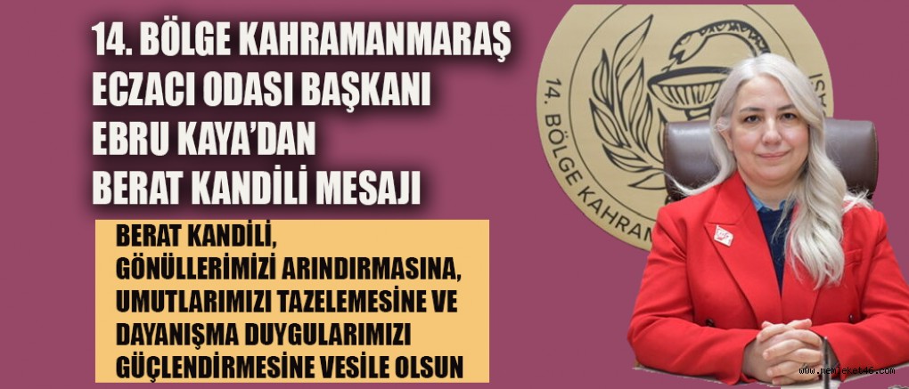 Eczacıların toplum sağlığındaki önemli rolüne vurgu yapan Kaya, bu anlamlı gecenin sağlık çalışanlarına moral ve motivasyon kaynağı olmasını dileyerek, “Başta eczacı meslektaşlarımız olmak üzere tüm sağlık camiamızın ve vatandaşlarımızın Berat Kandili’ni en içten dileklerimle kutluyorum. Dualarımızın kabul olmasını, işlerimizin hayırlı, gönüllerimizin huzurlu olmasını temenni ediyorum” dedi.