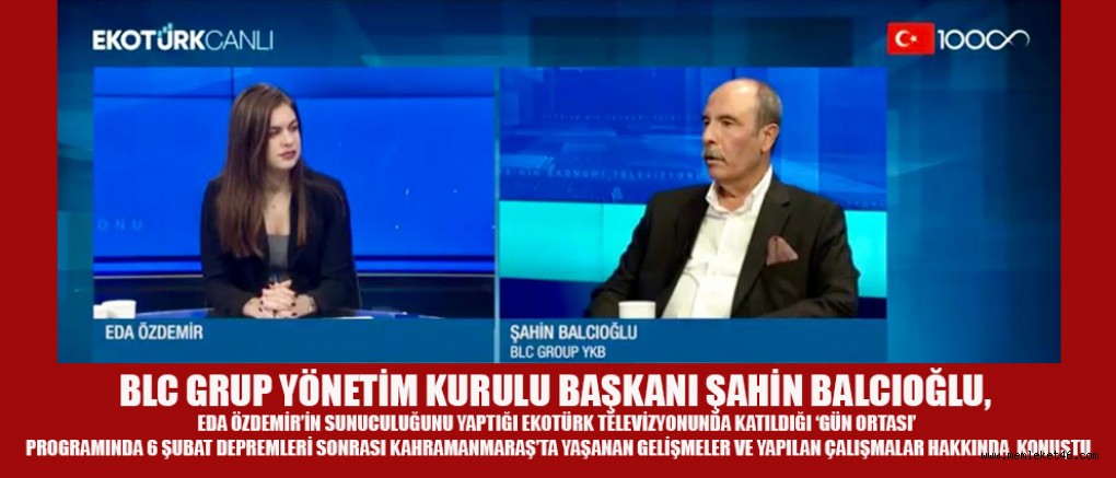 BLC Grup Yönetim Kurulu Başkanı Şahin Balcıoğlu, Eda Özdemir’in sunuculuğunu yaptığı EKOTÜRK televizyonunda katıldığı ‘Gün Ortası’ programında 6 Şubat depremleri sonrası Kahramanmaraş’ta yaşanan gelişmeler ve yapılan çalışmalar hakkında özel röportaj verdi.