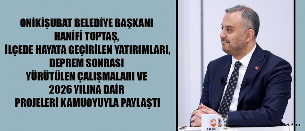 Onikişubat Belediye Başkanı Hanifi Toptaş, AKSU TV ekranlarında yayınlanan programda ilçede hayata geçirilen yatırımları, deprem sonrası yürütülen çalışmaları ve 2026 yılına dair projeleri kamuoyuyla paylaştı.