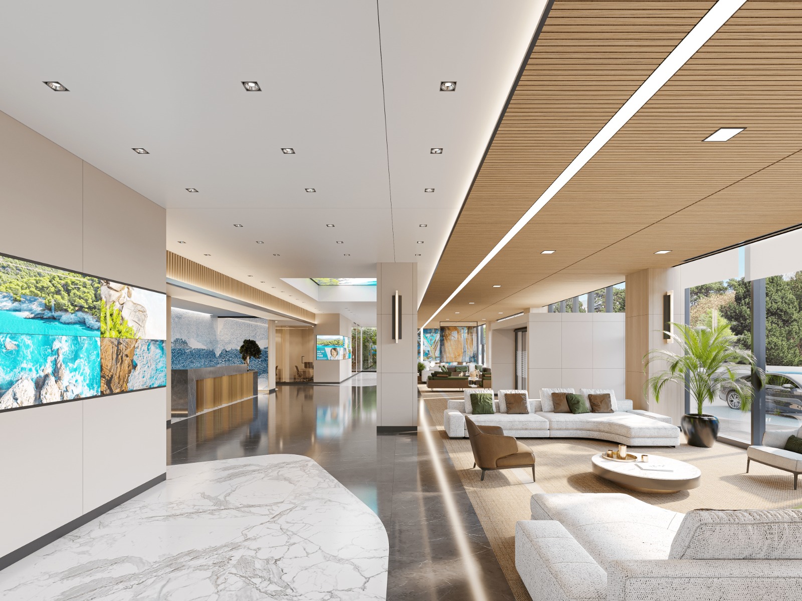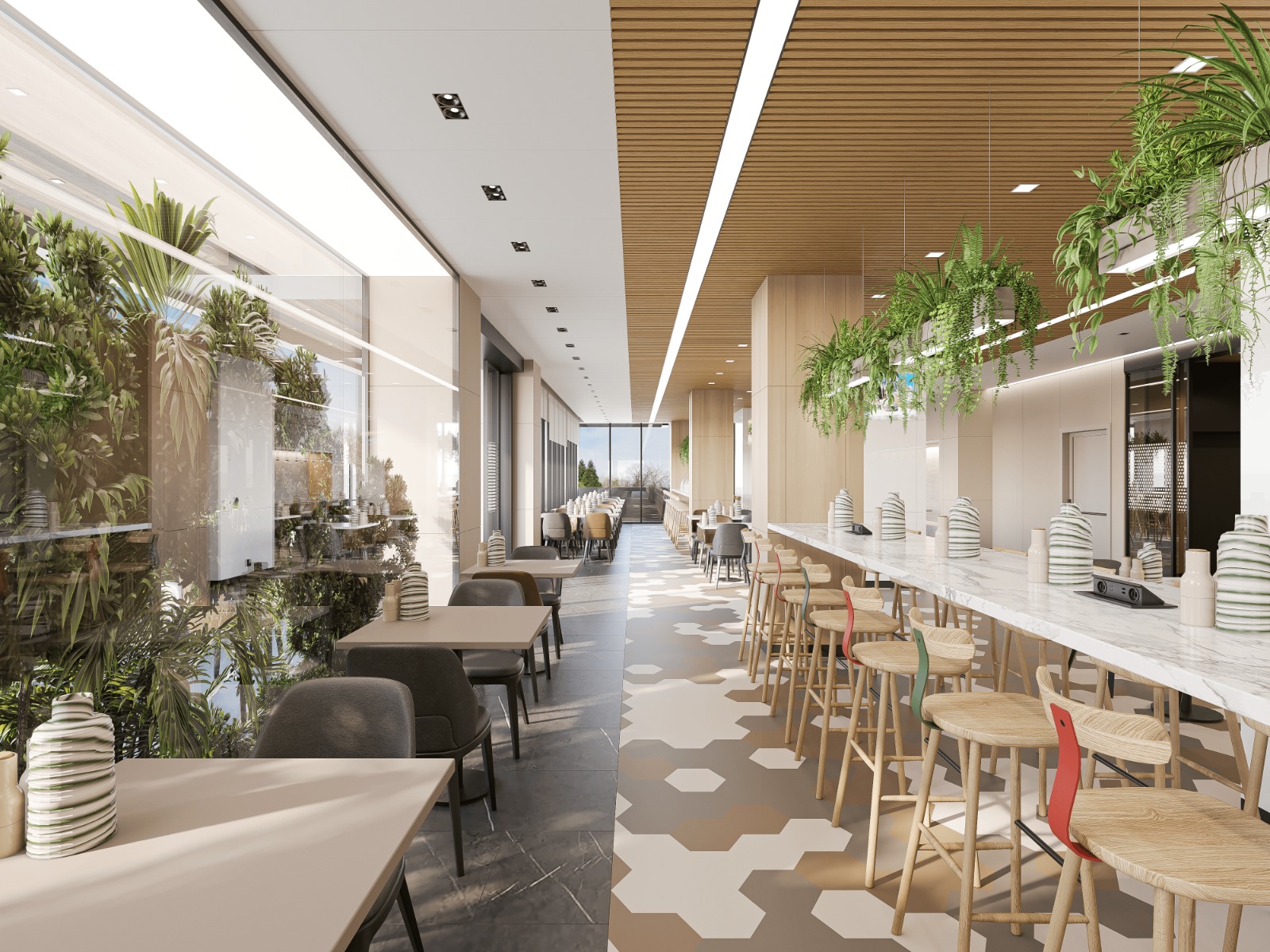 Hastanedeki ortak alanlar giyim mağazaları, kuaförler, fırınlar ve kafeteryalar gibi çeşitli olanakları içermektedir. Bu alanlar, genellikle sağlık ortamlarındaki monotonluğu kırarak farklı bir atmosfer sunmaktadır. Tasarım, hastanenin birçok yerinde doğal unsurların entegrasyonunu vurgulamaktadır.