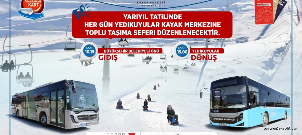 Kahramanmaraş Büyükşehir Belediyesi, yarıyıl tatili boyunca her gün şehir merkezi ve Yedikuyular Kayak Merkezi arasında ulaşımı sağlayacak otobüs seferleri düzenleyecek. Saat 10.00’da Büyükşehir Belediyesi önündeki otobüs durağından hareket edecek otobüsler, 15.00’da ise Yedikuyular’dan dönüş yapacak.